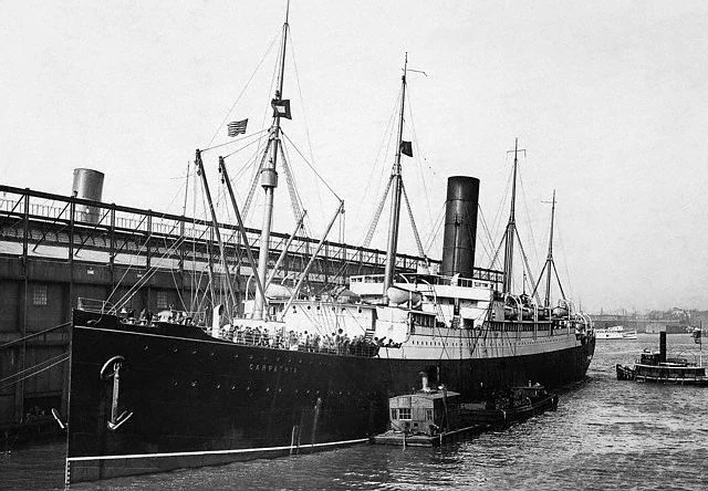 The RMS Carpathia arriving at Pier 54 with Titanic survivors.