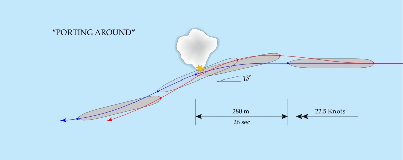 According to Fourth Officer Joseph Boxhall, Murdoch told Captain Smith that he was attempting to "hard-a-port around [the iceberg]", suggesting that he was attempting a "port around" manoeuvre – to first swing the bow around the obstacle, then swing the stern so that both ends of the ship would avoid a collision. There was a delay before either order went into effect; the steam-powered steering mechanism took up to 30 seconds to turn the ship's tiller,[23] and the complex task of setting the engines into reverse would also have taken some time to accomplish.[36] Because the centre turbine could not be reversed, it and the centre propeller, positioned directly forward of the ship's rudder, were simply stopped. This greatly reduced the rudder's effectiveness, thus handicapping the turning ability of the ship. Had Murdoch simply turned the ship while maintaining her forward speed, Titanic might have missed the iceberg with feet to spare.[37]