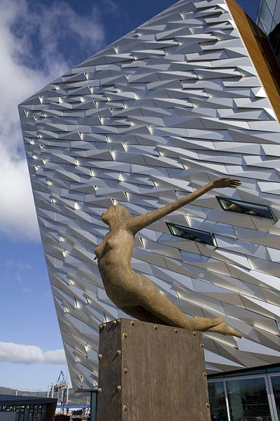 In front of the building is Titanica, a sculpture by Rowan Gillespie depicting a diving female figure. Made of bronze, it is mounted on a brass base, evoking the design of figureheads on ships' prows, and is meant to represent hope and positivity. The figure was dedicated by representatives of the Anglican, Catholic, Methodist and Presbyterian churches on 27 March 2012, a few days before the opening of Titanic Belfast.[13]